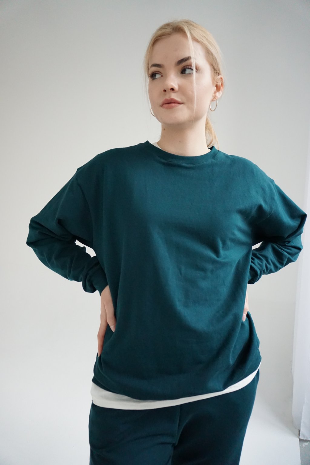 The beautiful dunkel petrol or dark kerosene color is the first to catch your eye on our crewneck sweatshirt. Combined with a minimalist design and a slightly looser fit, it was a clear choice.