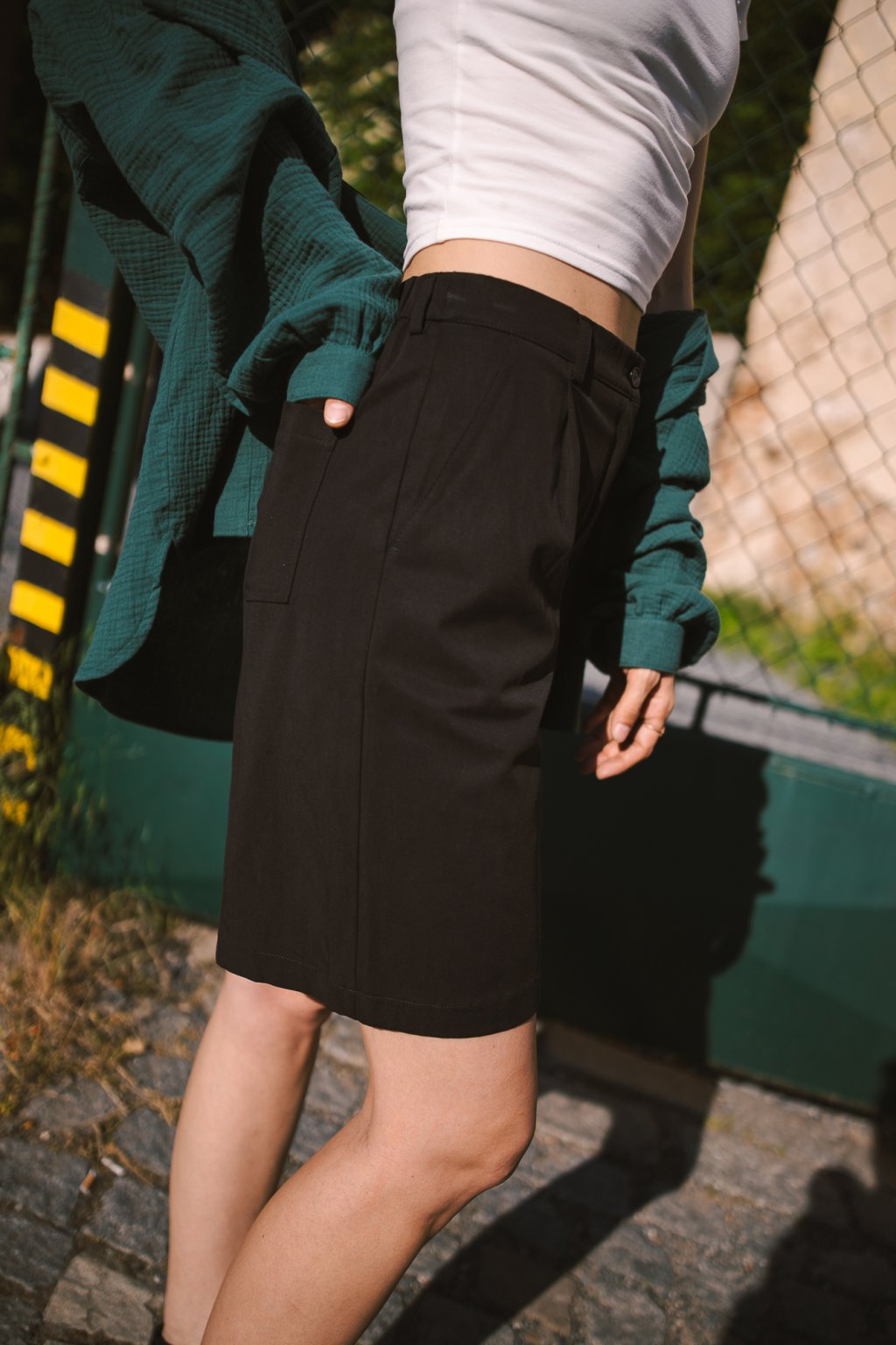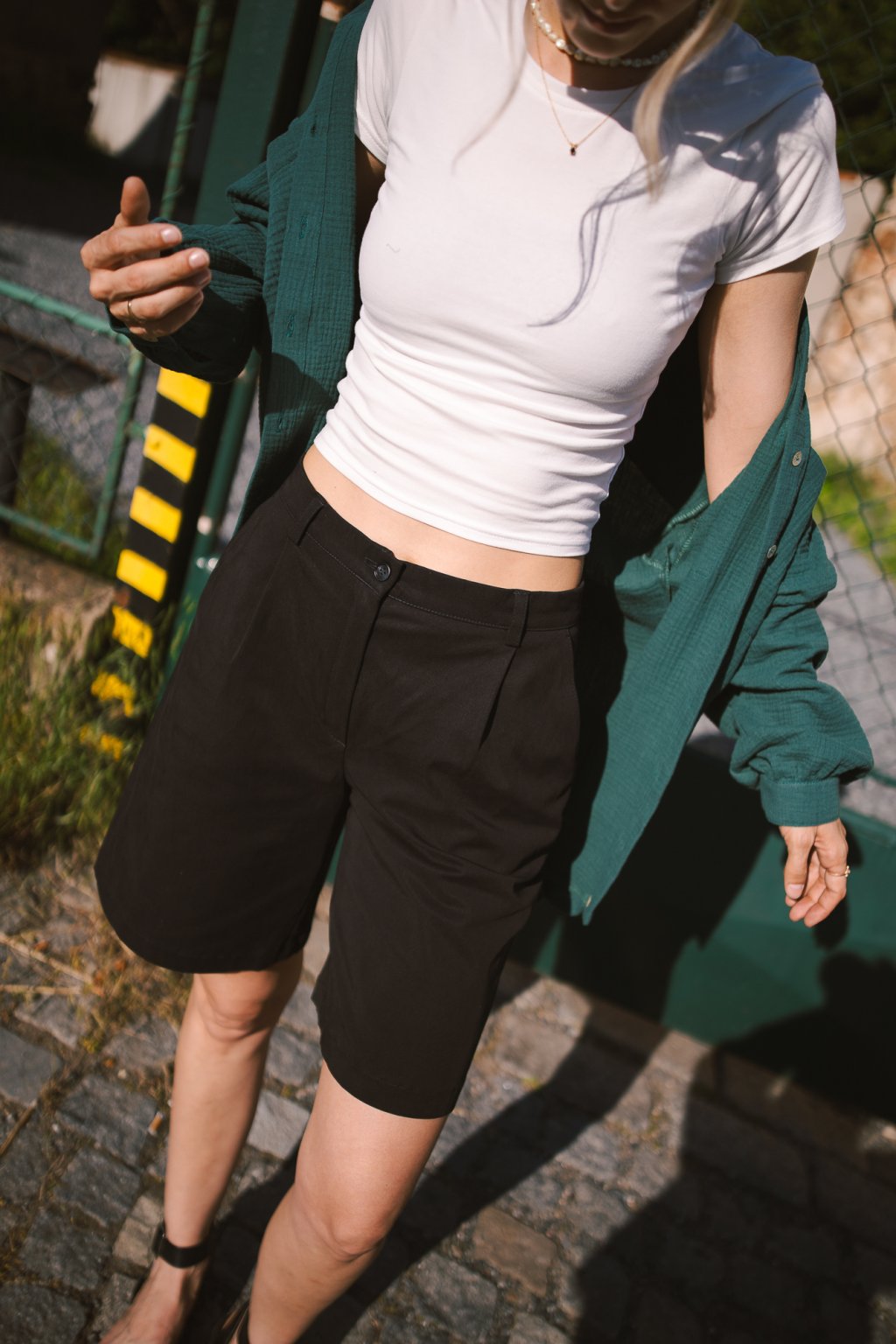 Díky delším nohavicím působí bermudy elegantně i ve chvíli, kdy je požadavek na formálnější vzhled, ale vy stále zůstáváte v dokonalém pohodlí. Černou nebo béžovou barvu lze snadno zkombinovat s bílou košilí, ležérním tričkem, svetrem i sportovní mikinou. Tenisky, lodičky, sandálky i kotníkové boty jednoduše střídáte podle příležitosti nebo nálady.