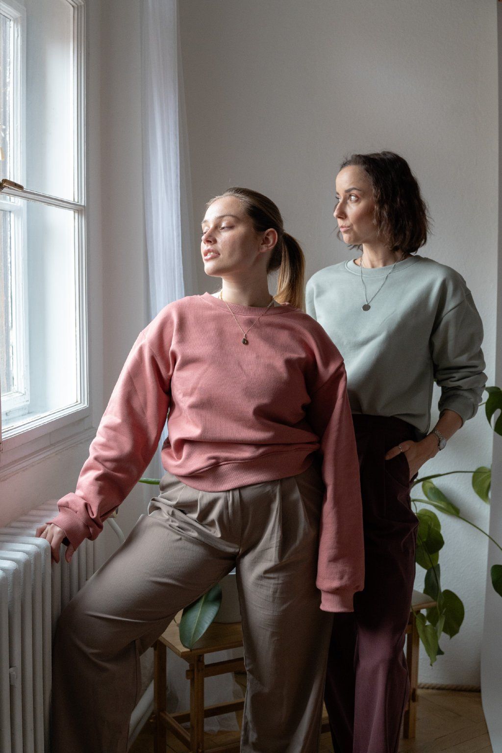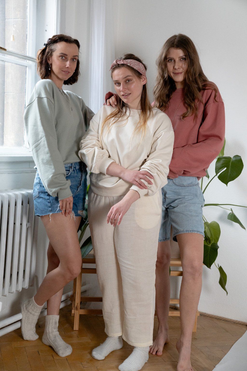 Modelky na fotce měří: 180 cm a má na sobě velikost S (krémová mikina); 168 cm ve vel. M (béžová mikina) a 173 cm ve vel. L (černá mikina).
